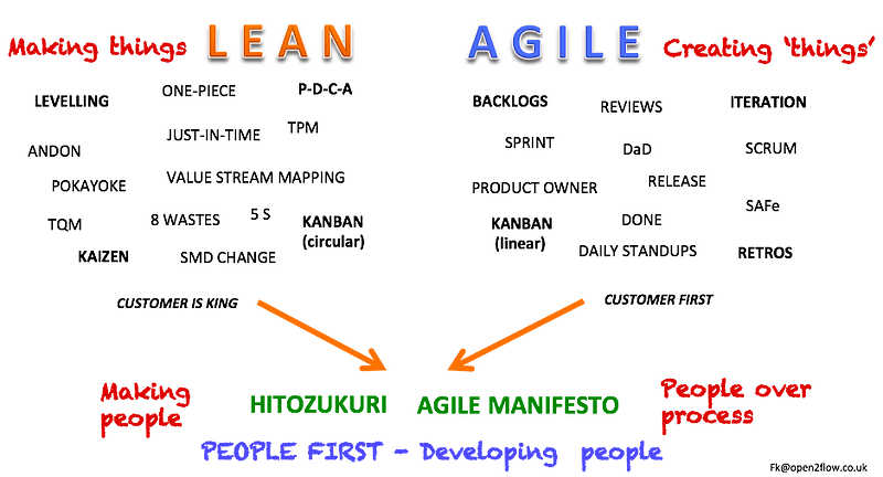 While Agile also has a technical side to it, expressed in Scrum, Product owners, Sprints, Reviews, SAFe, linear Kanban, DaD, Sprint Retros, Daily standups, Backlogs, etc., the essence of Agile is expressed in the Agile Manifesto, which is all about people before processes, customer satisfaction over profit and fundamentally putting the human aspect over the technical one. And that is fundamentally the same hitotzukuri (making people) aspect found in Lean; indeed that’s why Agile people often refer to the Lean heritage — sometimes thinking it is the same thing. In Agile the words Lean and Agile are used almost interchangeably, whereas in Lean that would be completely inconceivable; nevertheless the Agile Manifesto is where the two do join.